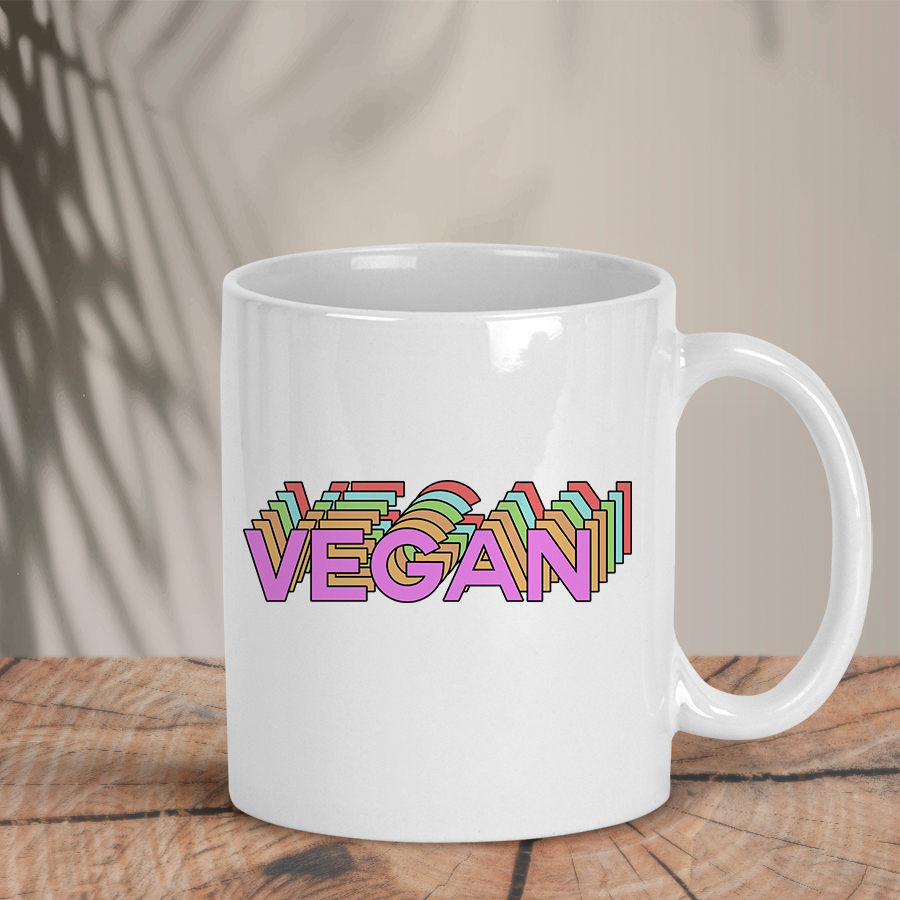 Η λευκή κούπα “Vegan 3D” τυπώνεται με sublimation υψηλής ανάλυσης ώστε τα παστέλ layers (ροζ, μέντα, πορτοκαλί, τιρκουάζ) να δείχνουν καθαρά, ζωντανά και να αντέχουν στην καθημερινή χρήση.