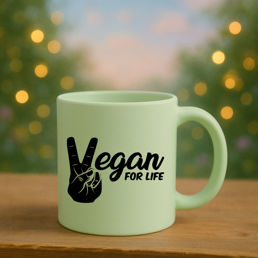 Το minimal γραφικό “Vegan for Life” (peace-hand που σχηματίζει το V) τυπώνεται με sublimation υψηλής ανάλυσης, ώστε το μαύρο να παραμένει καθαρό και ευδιάκριτο στην καθημερινή χρήση.