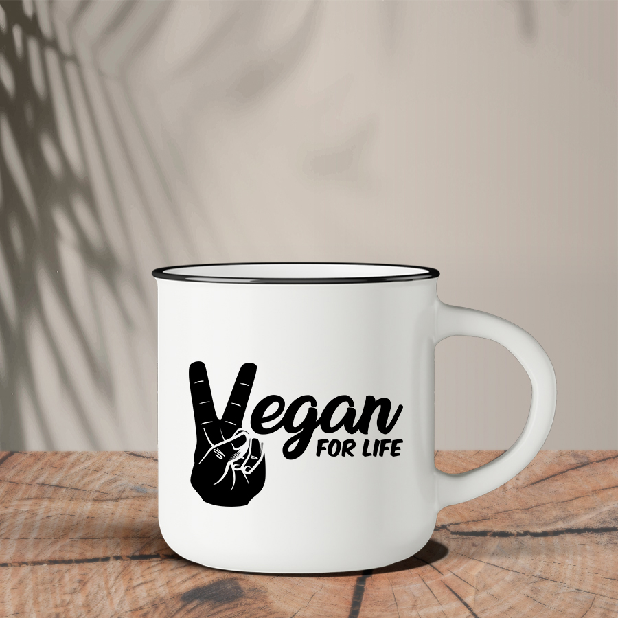 Η ρετρό κεραμική κούπα “Vegan for Life” συνδυάζει κλασικό σχήμα με μαύρο ρέλι και minimal γραφιστική με τη χειρονομία peace που σχηματίζει το γράμμα V.