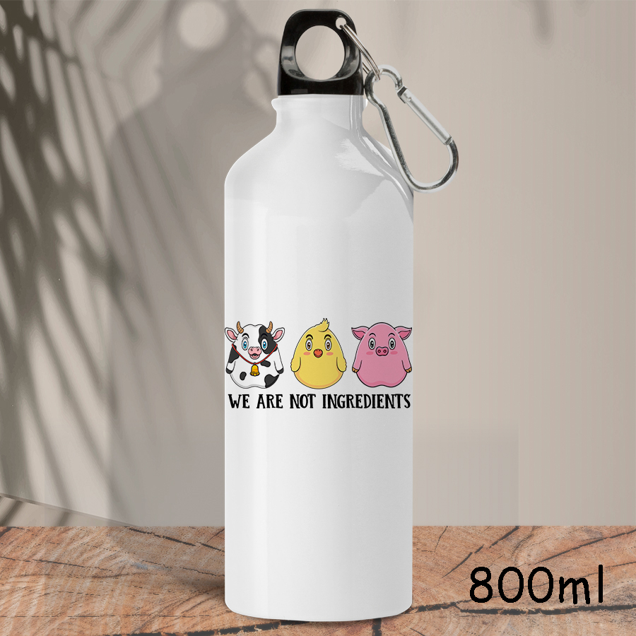 Το ανοξείδωτο μπουκάλι 800ml με το σχέδιο “We Are Not Ingredients” συνδυάζει χαριτωμένο design (αγελαδίτσα, κοτοπουλάκι, γουρουνάκι) με πραγματική χρησιμότητα.